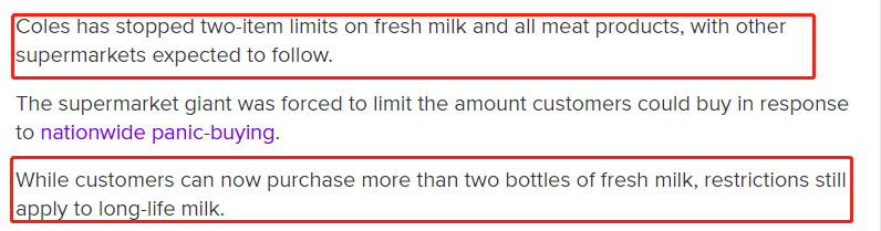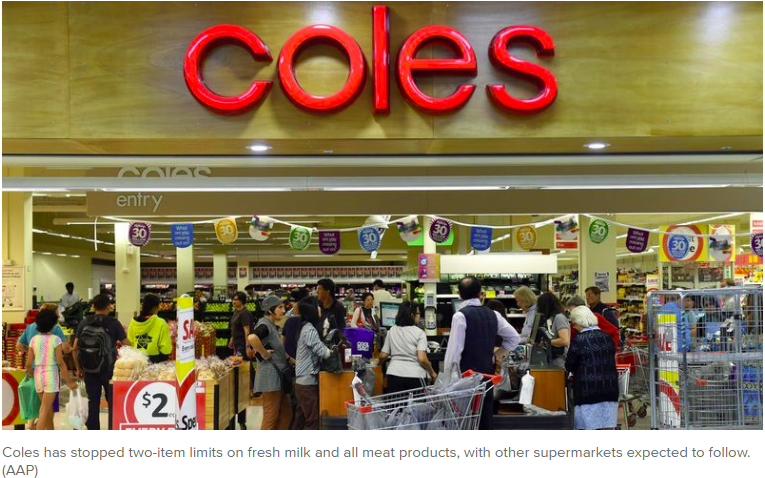 Coles取消了对鲜牛奶和所有肉类产品的限购要去,预计其他超市也会紧随其后。