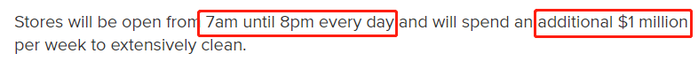 Coles表示超市的营业时间是一周7天,每天7am-8pm,Coles每周将额外花费100万澳元进行超市内的大范围清洁。