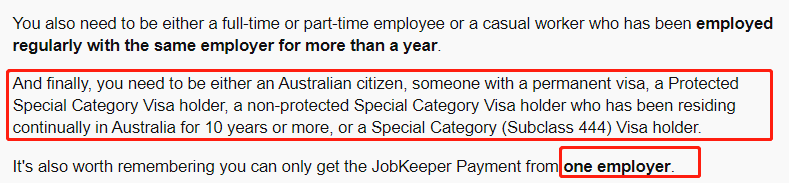 所有雇员能且只能从一位雇主处获得留职补贴(JobKeeper Payment)。