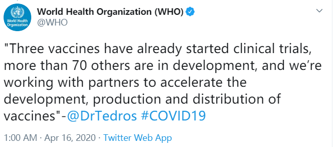 WHO表示,在全球范围内,有三种COVID-19疫苗已经在进行人体试验,现有超过70种不同的COVID-19疫苗正在研发中,WHO正在致力于加快疫苗的研发,生产和上市。