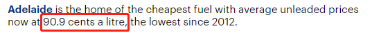 阿德莱德的汽油价格为所有州际大都市中最便宜的,目前Unleaded汽油均价为每升0.91澳元,不到1刀!这是自2012年以来的最低。