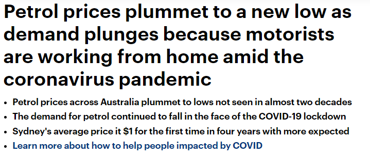 由于疫情压低了全球石油价格,汽油价格继续在澳大利亚创下新低。