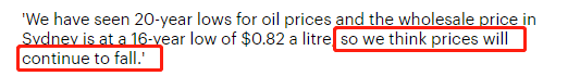 NRMA发言人Peter Khoury说:“这对澳大利亚驾驶者来说是个好消息,这是油价的20年新低,我们认为油价或将持续下跌。”