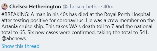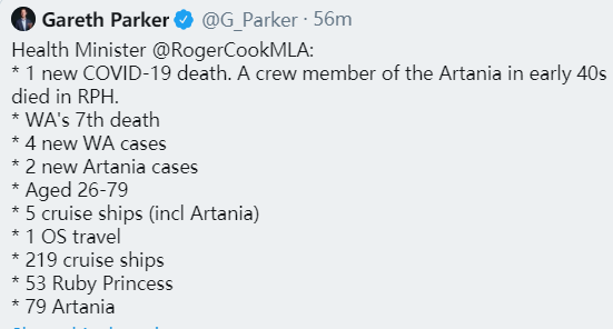 死亡新增一例,西澳死亡人数增至7例。一名40多岁的男子确诊后在皇家珀斯医院死亡。他是Artania游轮上的一名船员。