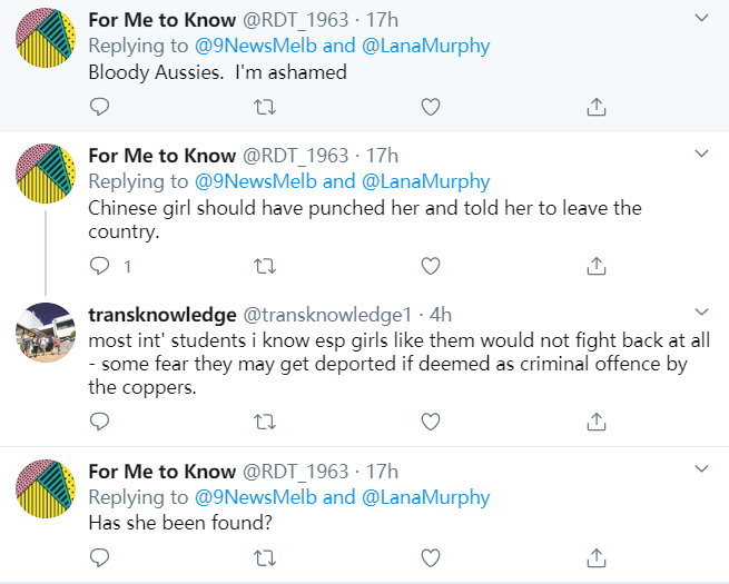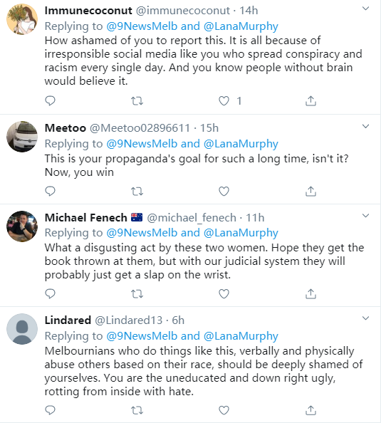 据9 News报道,这两位女学生先是被口头侮辱,有人大声喊道“滚回中国”。