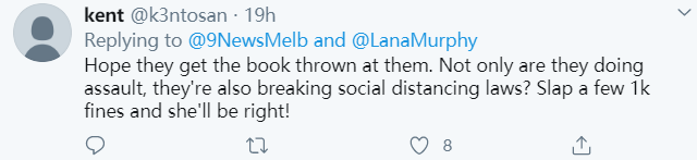 “希望她们把书扔给那些袭击者。她们还在违反了保持社交距离的规定? 开她们几千澳元的罚单,她们就知道厉害了!”