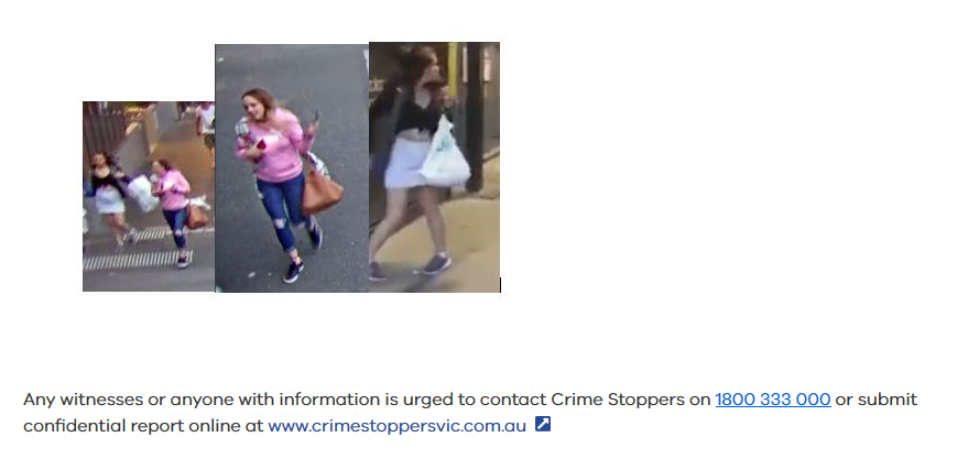据录像显示,其中一名女性嫌犯是白人,年龄约20岁,身高约150厘米,瘦削,齐肩的棕色头发。她穿着深色上衣和浅色裙子。