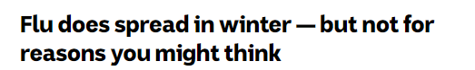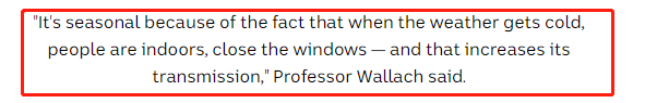 Wallach教授说:“流感确实是季节性的,但这主要是因为当天气变冷时,人们主要待在室内,并关上了窗户,减少了通风,这种环境加强了病毒的传播能力。”
