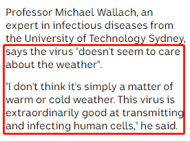 悉尼科技大学(University of Sydney)传染病专家Michael Wallach教授表示,这种病毒“似乎天气对其无太大影响”。