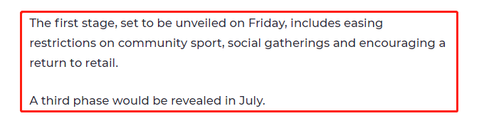 第一阶段将于本周五公布,具体政策将包括放宽对社区体育,社交聚会的限制,并鼓励零售业重返市场。