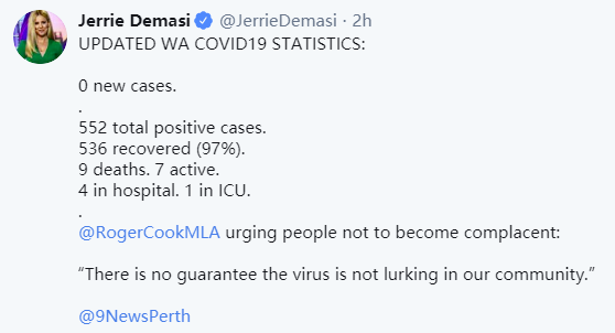 已有536例痊愈(97%),至今西澳共有9人去世。