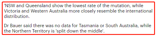 Bauer博士表示,世界范围内,感染这种突变菌株的病例为总确诊病例的三分之二,而澳洲境内,新州和昆州的突变菌株感染病例较低,而维州和西澳则与世界平均水平持平,为三分之二。