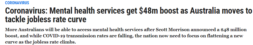 国家卫生部长Greg Hunt表示,“对健康的担忧,隔离期间的孤独,对工作的焦虑,对小企业的财务状况,抵押贷款等压力,疫情带来的所有这些压力都带来了特定的心理健康挑战。”