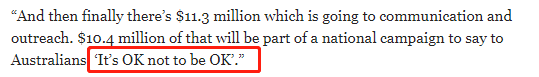 “最后,有1130万澳元将用于交流和宣传。其中的1040万澳元将被用于一项全国性的活动,‘It’s OK not to be OK’”。