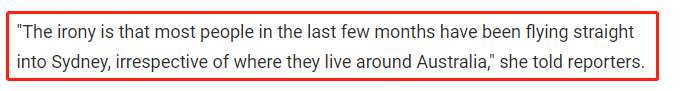 “具有讽刺意味的是,在过去的几个月中,大多数人返澳的选择都是先直飞悉尼,无论他们住在澳大利亚哪个地区”她对记者说。