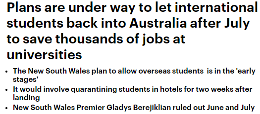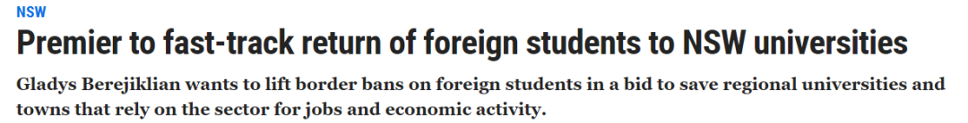 标题: 国际留学生或可直飞悉尼8月返澳!新州州长呼吁为留学生快速返澳提供方便!