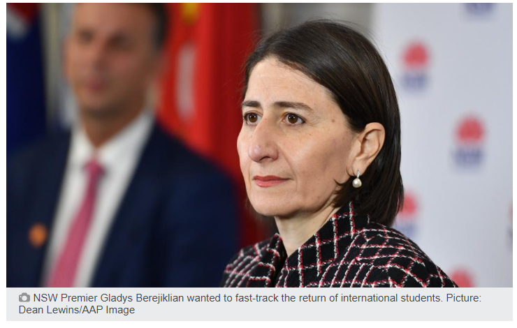 新州州长Gladys Berejiklian希望针对留学生放宽边境禁令,她表示,已经制定了相关计划,该计划处于发展的“早期”阶段,该计划要求学生在抵达悉尼后立即统一在酒店隔离两个星期。