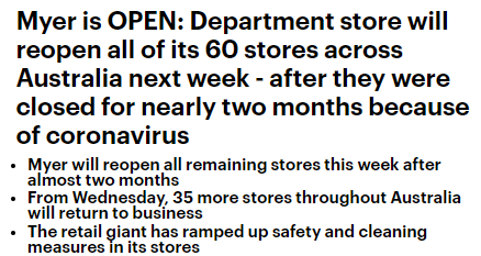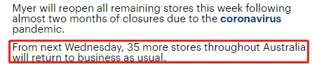 标题: Myer所有门店恢复营业!Myer下周将重新开放其全部60家门店!