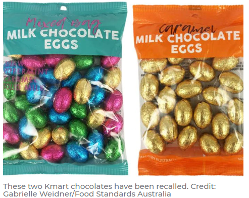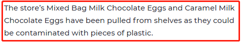 Kmart的混合袋装牛奶巧克力蛋(Mixed Bag Milk Chocolate Eggs)和焦糖牛奶巧克力蛋(Caramel Milk Chocolate Eggs)已从货架上撤下,因为产品内可能有塑料碎片。