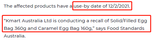 “澳大利亚Kmart有限公司正在召回360克Solid/Filled Egg Bag 和 160克的Caramel Egg Bag”澳大利亚食品标准局表示。