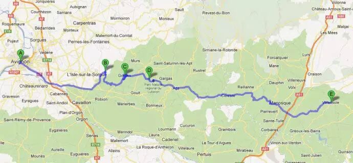 从马赛坐24或者25路LER巴士去马诺斯克,然后换乘小镇的大巴,但是沿途无法欣赏到美丽的花海,所以最靠谱的方法就是自驾。由阿维尼翁出发的路线如图。