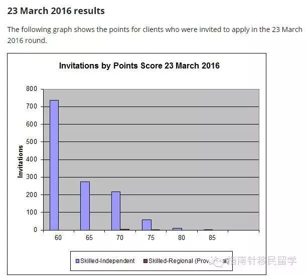 从本次邀请的获邀分数分布图上看,本轮邀请的主力军的分数是60和65分,但此轮邀请以60分申请人占绝大多数,60分的递交人群主要是除了三大热门专业(会计,ICT和programmer)以外的其他专业(工程,Nursing,computer network等都属于非热门专业),前进速度从上一轮的2月18号推进到了3月14号,速度加快。