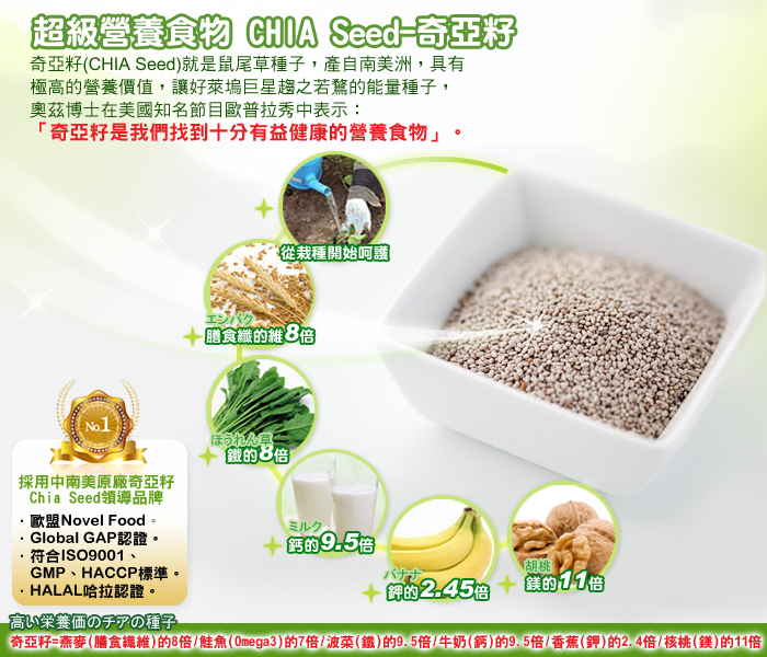 奇亚籽(Chia Seeds)是这几年澳洲非常流行的健康营养食物之一,在超级食物(Superfood)里营养成分和保健作用都是极其强大的。早期产自中南美洲,近年来因澳洲得天独厚的自然生长条件,优良的空气和土壤,已经成为奇亚籽最大生产国。奇亚籽富含多种营养成分,被欧美国家称赞为“神奇籽”、“超级籽” 。现在是美国FDA认证的安全食品,也是欧盟立法确认的面包添加成分。
