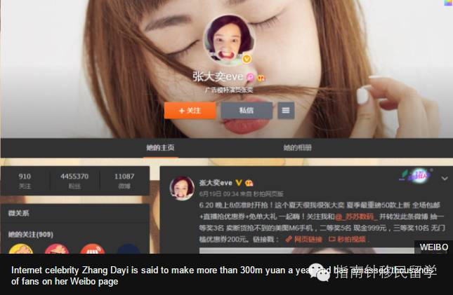 文章称,中国赚的最多的网红之一,在微博上有四百万粉丝,去年的收入高达3亿人民币!!比范冰冰还高......