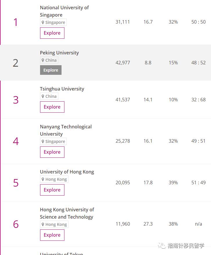 ★根据前十的榜单来看,前五名基本被新加坡和中国霸占了,新加坡国立大学和南洋理工大学分别排名第1和第4,中国的北京大学排名第2,清华大学排名第3。但是新加坡除了这两所大学之外,其他的大学排名都比较靠后(第三名都排到120以后了),所以整体上还是中国略胜一筹。名气非常响亮的香港大学排名第五,香港科技大学排名第六,之后就是日韩的学校了,东京大学排名第7。