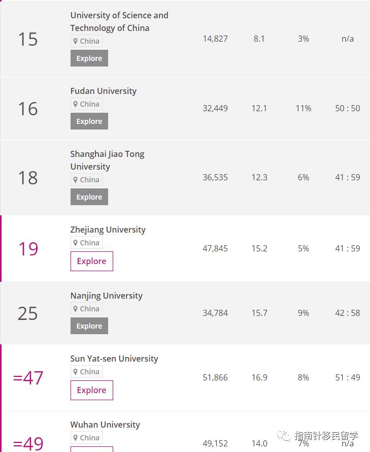 ★如果光凭北大清华这两所在中国教育界超然物外的两所大学,还不足以证明中国教育整体的霸主地位,那么看看榜单上还有多少所其他的中国大学,你就知道,中国高等教育教学质量的崛起已经势不可挡了。除去清华北大之外,中国还有中国科技大学,复旦大学,上海交通大学,浙江大学进入了前20,亚洲前20中国的大学就占了1/3。南京大学,中山大学,武汉大学也表现出色,分列25,47,49位。