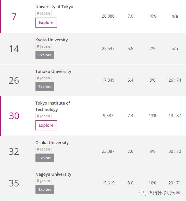 日本也有12所大学进入亚洲100强,但是过去表现抢眼的东京大学和京都大学,下滑较为明显。东京大学一度被评为亚洲最好的大学,但是这一次的泰晤士亚洲大学排行榜中,东京大学这一次仅排名第七。京都大学排名14,东北大学排名26,过去特别强势的大阪大学(曾经的亚洲前十)这次仅排名32。